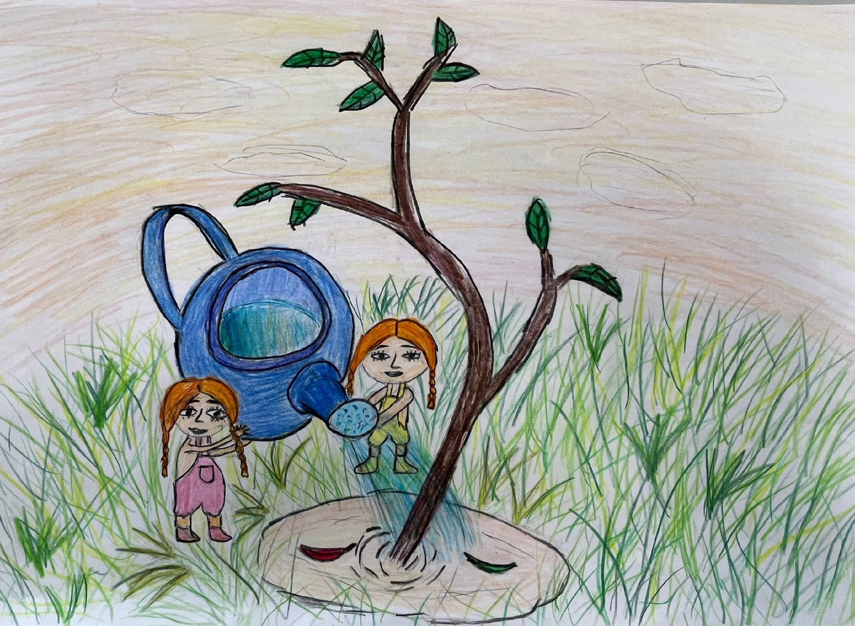 Описание: На конкурс творческих работ, посвященных 90-летию со дня рождения Николая Рубцова, я решила нарисовать иллюстрацию к стихотворению «Маленькие Лили». В своем рисунке я попыталась передать настроение стихотворения-шутки. Я сразу представила лето и двух крошечных девчонок с косичками, которые из огромной лейки поливают желтый прутик. Их труд принес результат — на прутике стали появляться листочки. Стихотворение веселое, доброе и его мо