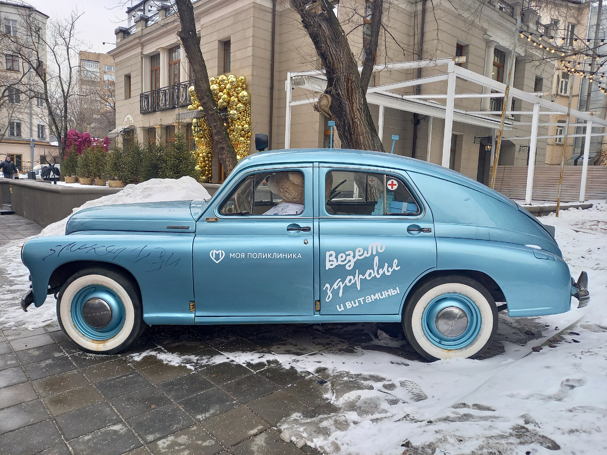 Первое интересное место — поликлиника, которую, видимо, совсем недавно отреставрировали. Перед ней установлена вот такая интересная машина, на которой написано «Везем здоровье и витамины».