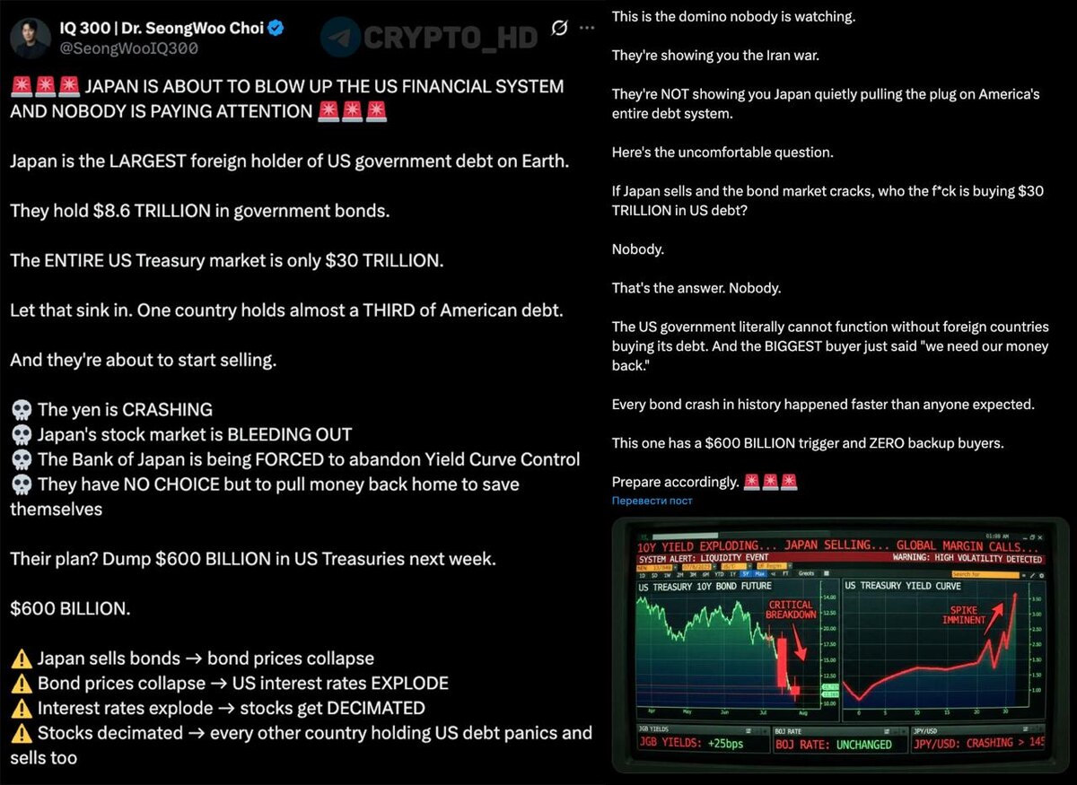🇯🇵 Среди паникеров в Twitter гуляет еще одна теория с предстоящим «глобальным финансовым коллапсом». Логика этой версии строится вокруг того, что проблемы в самой Японии – слабая иена, давление на финансовую систему и необходимость возвращать капитал домой – могут вынудить крупнейшего иностранного держателя трежерис начать масштабную распродажу. А дальше уже включится классический эффект домино: рост доходностей, распродажа риска, стресс в акциях, долларовой ликвидности и на глобальных рынках. Япония якобы уже на следующей неделе сбросит американские гос. облигации на $600b, что и запустит цепную реакцию. Автор заявляет, что Япония держит $8,6T в госдолге США. Но реальность такова, что хоть Япония и является крупнейшим иностранным холдером трежерис, на балансе страны хранится около $1,1T (почти в 7 раз меньше). Crypto Headlines