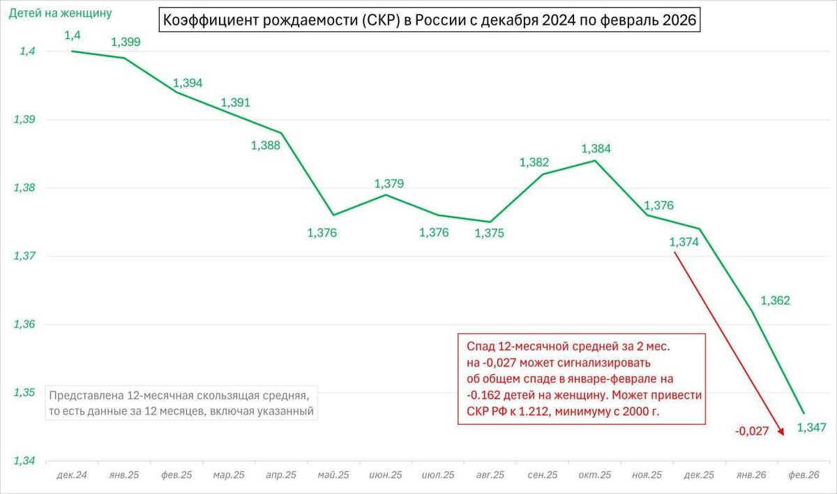 По итогам 2026 года показатель может составить 1,212 на одну женщину. Это рекордно низкий уровень за последние 26 лет.
