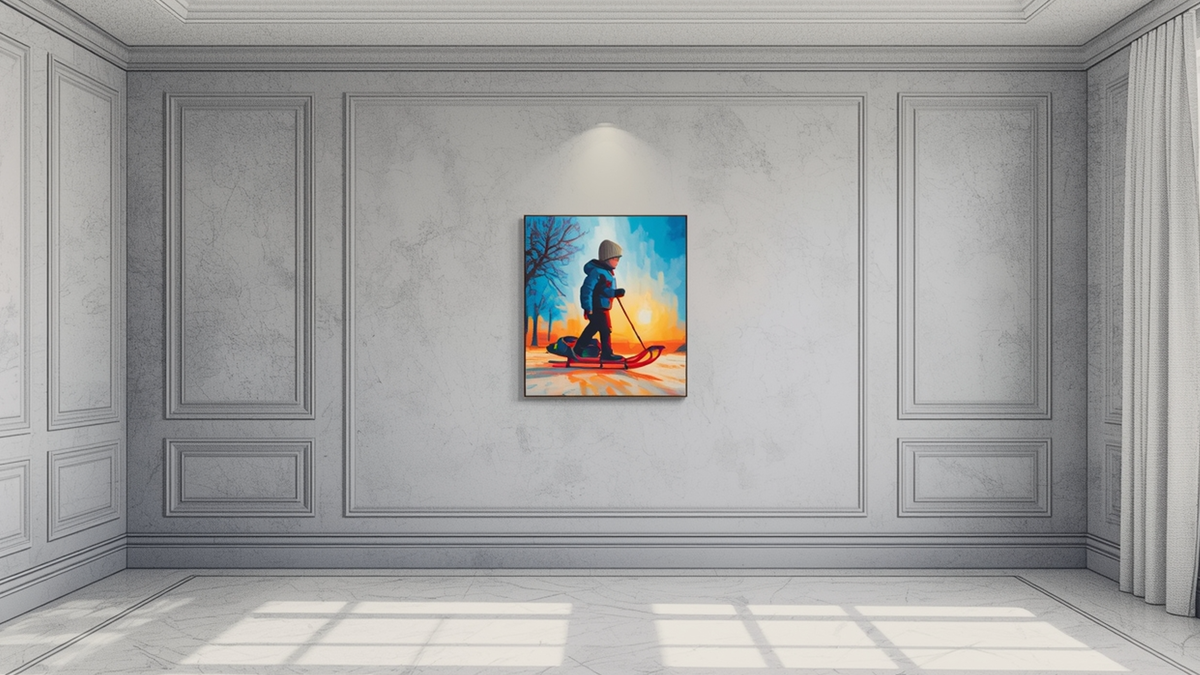 Он прошелся вдоль стены, смотрел на картины. Долго задержался у одной, измайловской, где мальчик в синей куртке везет санки через двор, один, и смотрит вверх.