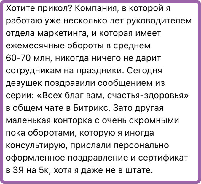 А могли не дарить, просто решили так и все. Но, например, раньше праздновали НГ (боулинг и т.п.), а в этом году решили не праздновать - стало жалко денег. А я читаю недоумевание девушки и хочется нежно ответить - да никто тебе ничего не должен кроме зарплаты в обмена на функциональные обязанности, закрепленные в трудовом договоре :) Остальное - жесты доброй воли при наличии желания и бабулек на исполнение. Лично я считаю все эти подарки - корпоративы - отмечания и т.п. просто выбросом денег на ветер, кои никоем образом не создают team building :) Русский ИТ бизнес + Мы в MAX