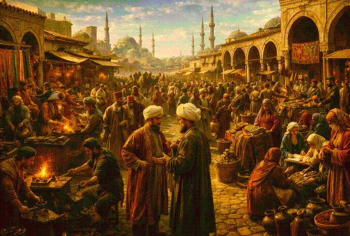 Ладно, признаюсь честно. Я как-то раз запоем смотрела «Великолепный век» — ну вот всё, три ночи подряд, муж уже смотрел на меня с подозрением. И знаете, что меня зацепило? Не Хюррем, не султан и не эти бесконечные интриги в гареме. А мысль: неужели вся жизнь в огромной империи сводилась к тому, кто понравится повелителю? Не верю. Не могла такая махина держаться только на красивых глазах. Полезла читать. И вот что выяснила. Представьте огромный живой город. Шум базаров, запах кофе и специй, верблюды с тюками, крики торговцев на десяти языках. Это был реальный экономический центр мира — между Европой и Азией, и всё через него. Наложницы? Да, были. Но это крошечная часть картины. Огромная империя держалась на тысячах совершенно других людей. Начнём с того, что там была целая система гильдий. Как средневековые цеха в Европе, только своё, восточное. Кузнецы, гончары, кожевники, оружейники — все объединялись, устанавливали правила, следили за качеством. Это была серьёзная городская экономика