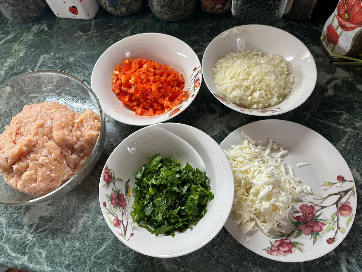 Для начала займемся самой интересной частью — начинкой. Именно она делает обычное мясо праздничным блюдом. Возьмите глубокую миску, смешайте мелко нарезанные овощи и зелень с фаршем, добавьте специи.