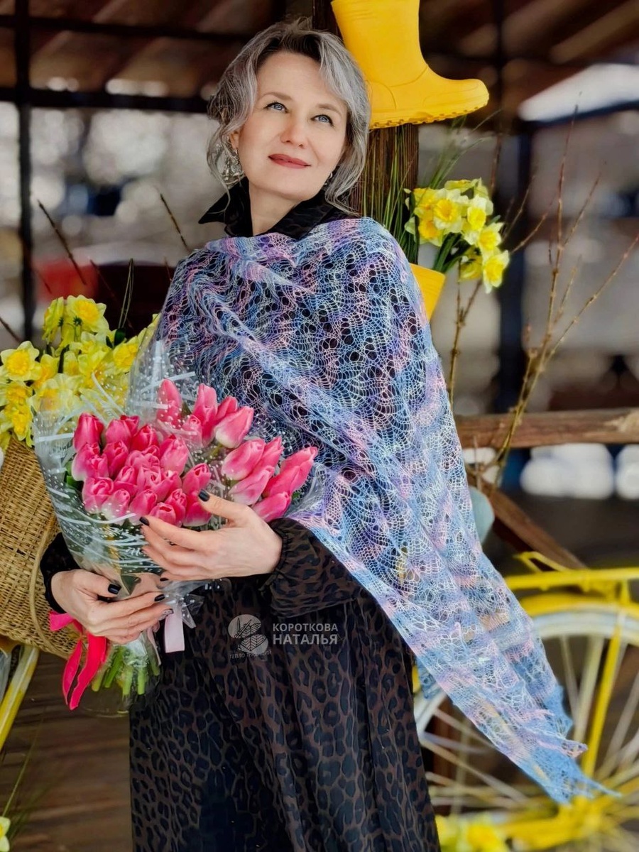 Пуховый палантин - паутинка связан спицами из козьего пуха ручного крашения , отпряденного по шелку . Размер 190 на 80 см , вес 110 грамм