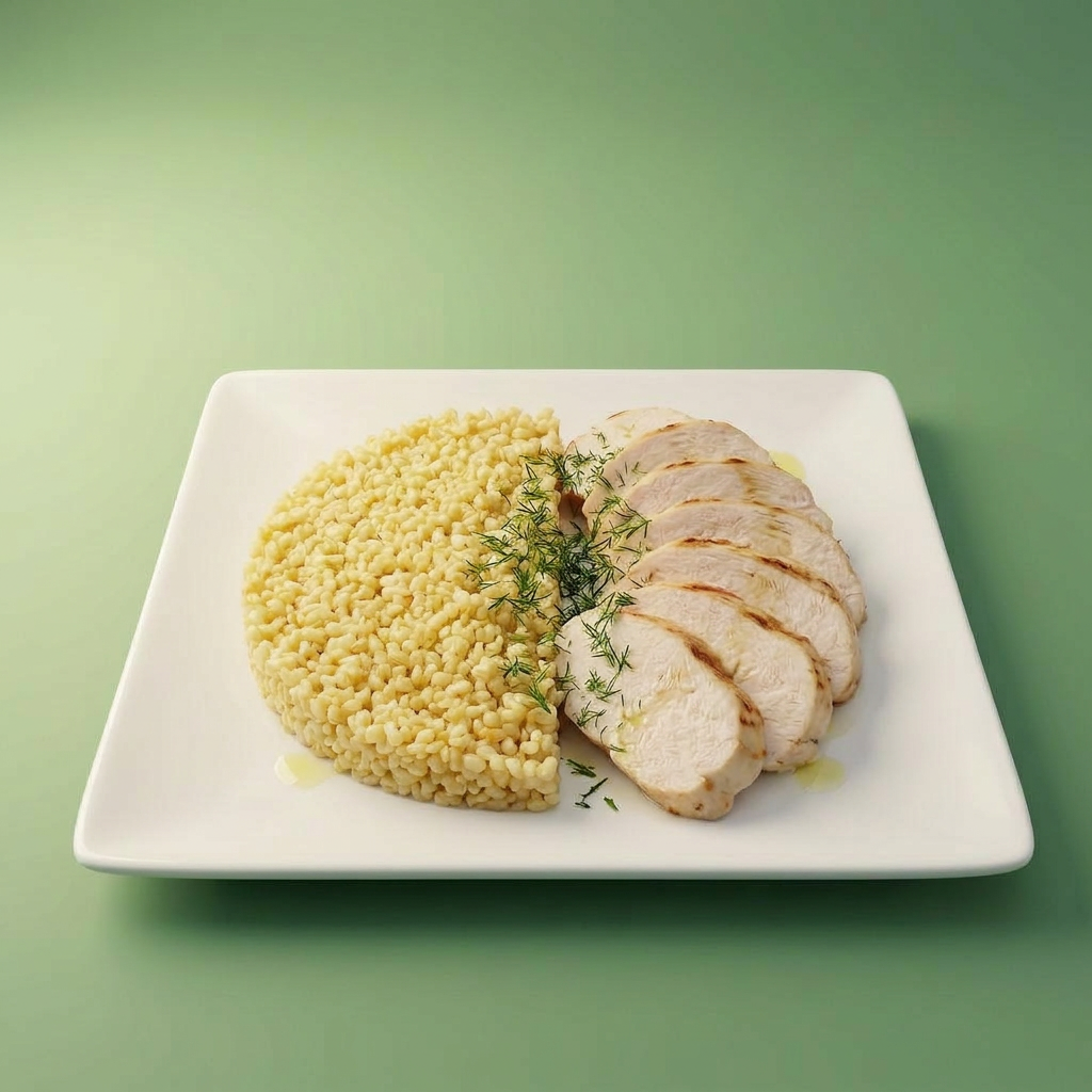КБЖУ на 1 порцию (примерно, из расчёта 70 г индейки + 40 г сухого булгура):