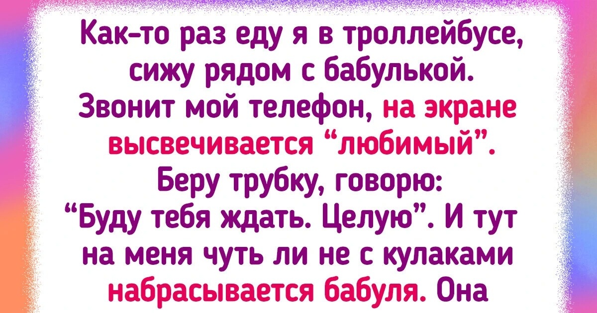 Мой муж записан у меня в телефоне «любимый». Как-то раз еду я в троллейбусе, сижу рядом с бабулькой. Звонит мой телефон, на экране высвечивается «любимый». Беру трубку, говорю: «Буду тебя ждать. Целую». И тут на меня чуть ли не с кулаками набрасывается бабуля. Она отчего-то подумала, что я при наличии мужа разговариваю с любовником, и решила меня повоспитывать.