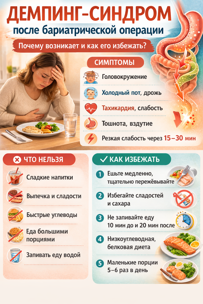 Представьте сцену. Все едят торт. Вы решаете: ну один кусочек, это же праздник. Через двадцать минут вы бледная, вас бросает в пот, сердце стучит где-то не там, и единственное желание - горизонтальное положение. Поздравляю. Вы познакомились с демпинг-синдромом. Он не смертельный. Но запоминается с первого раза. Некоторые говорят, что именно после этого знакомства навсегда теряют интерес к сладкому. Медицина называет это побочным эффектом. Диетологи - удачей. После бариатрической операции желудок стал меньше. Еда проходит в кишечник быстрее, чем раньше. Обычно это хорошо. Но если еда богата сахаром или жиром - кишечник получает её быстро и в концентрированном виде. И устраивает панику. Организм реагирует мгновенно: Это и есть демпинг-синдром. Быстрый, неприятный и очень доходчивый. Организм не злится. Он просто даёт обратную связь. Очень громко. Симптомы демпинг-синдрома делятся на ранние и поздние. Да, их два вида - организм явно старается. Ранний демпинг - через 10-30 минут после еды
