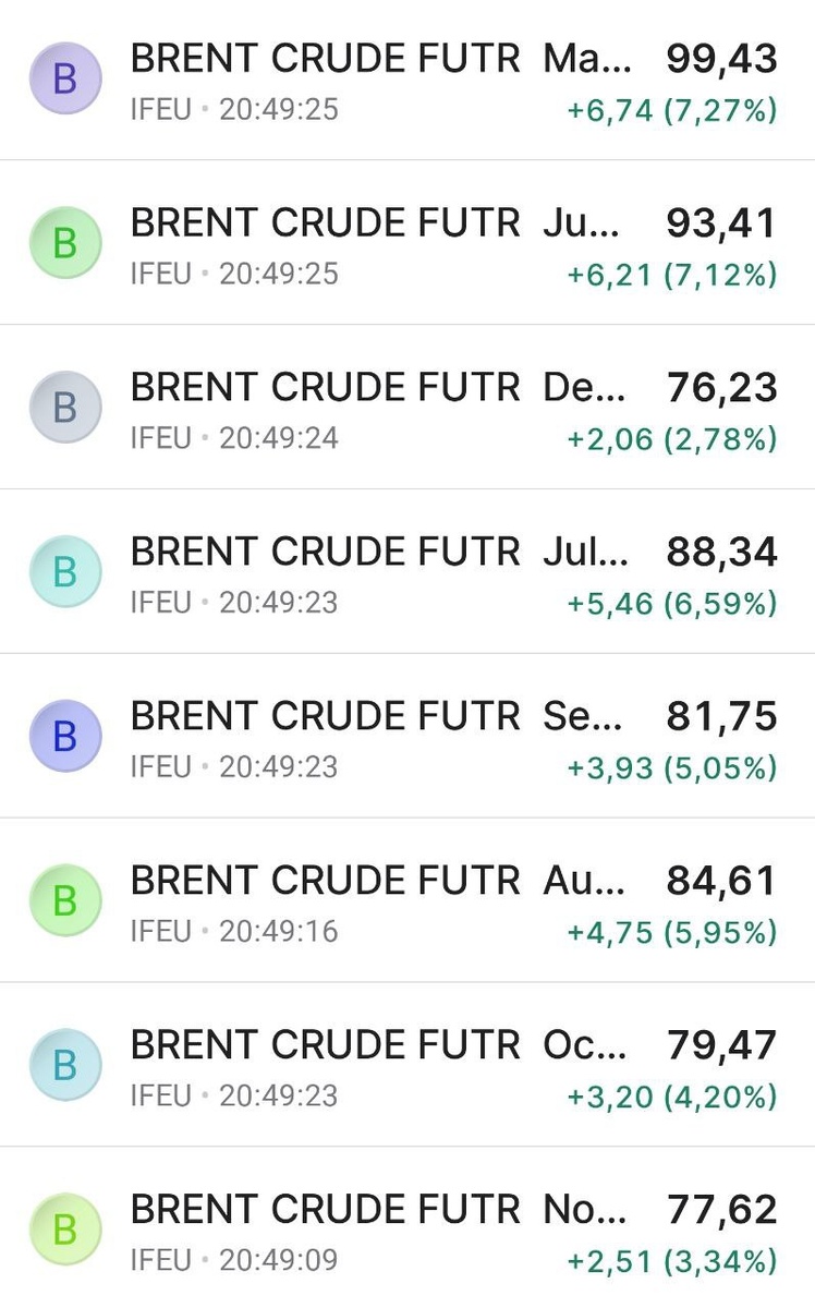 Фьючерсы на бирже ICE Futures Europe (Великобритания) Сейчас BRENT $100 май $99.43 июнь $93.41 июль $88.34 август $84.61 сентябрь $81.75 октябрь $79.47 ноябрь $77.62 декабрь $76.23 Бэквордация - это когда дальний фьючерс дешевле ближнего и дешевле спота. Бэквордация нефтяных фьючерсов - не редкость. Возникает, когда участники рынка ждут дефицит предложения или резкий краткосрочный рост спроса на нефть