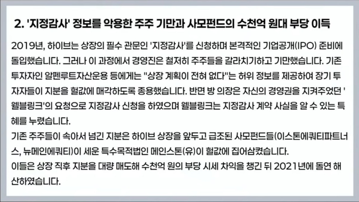 2. Обман акционеров с использованием информации о "назначенном аудите" и незаконная прибыль частных фондов на тысячи миллиардов вон. В 2019 году Hybe подала заявку на "назначенный аудит", который является обязательной процедурой для выхода на биржу, и начала полноценную подготовку к первичному публичному размещению акций (IPO). Однако в этом процессе руководство компании систематически разделяло акционеров и вводило их в заблуждение. Существующим инвесторам, включая Alpenroute Asset Management, была предоставлена ложная информация о том, что "планов по выходу на биржу нет", из-за чего долгосрочных инвесторов побуждали продавать свои доли по заниженной цене. В то же время председатель Бан Шихёк по просьбе Wellblink, которая помогала ему сохранять управленческий контроль, подал заявку на назначенный аудит, благодаря чему Wellblink получила преимущество — возможность заранее узнать о заключении договора на назначенный аудит. Доли, которые прежние акционеры передали, будучи введёнными