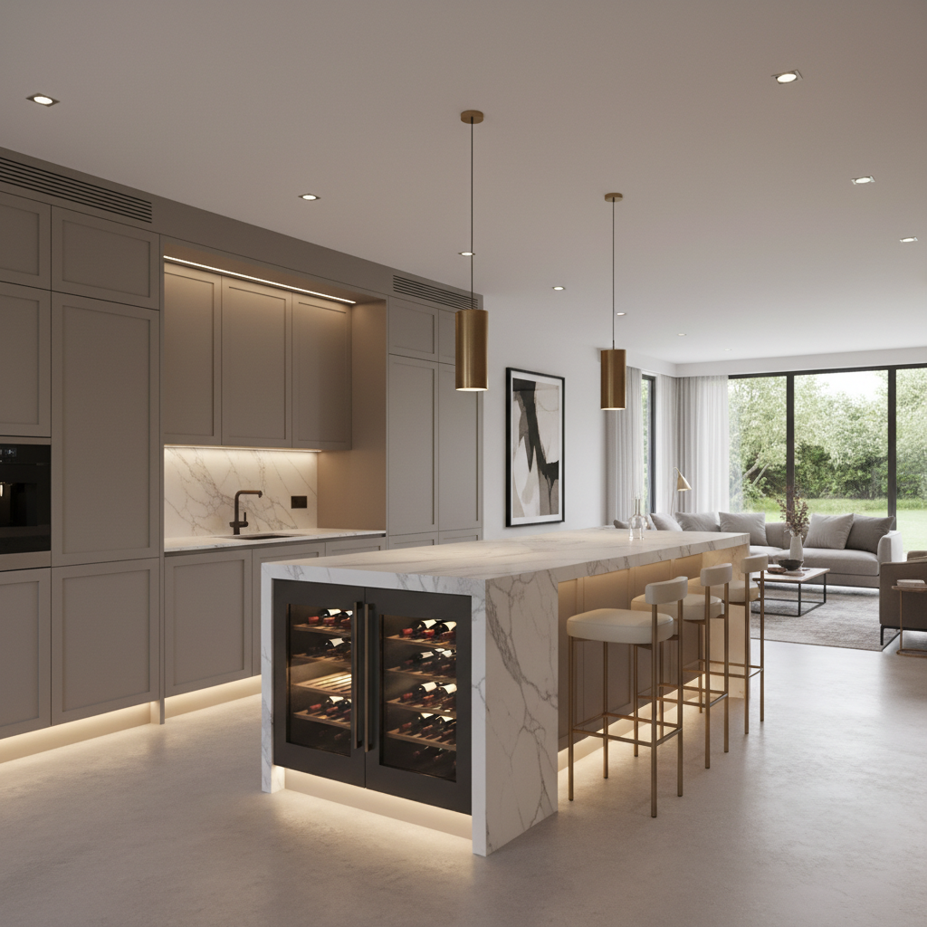 И самое главное — розетки и вода. Врезать мойку или варочную панель в остров — решение удобное. Но подвод воды, канализации и электричества нужно тянуть по полу. Это делается до стяжки. Забетонировали пол — всё, остров будет просто тумбой без коммуникаций, если вы заранее не вывели трубы. Многие про это забывают, а потом кусают локти. И да, вытяжка над островом с плитой нужна мощная, встраиваемая в потолок, и монтировать ее тоже нужно до чистовой отделки.