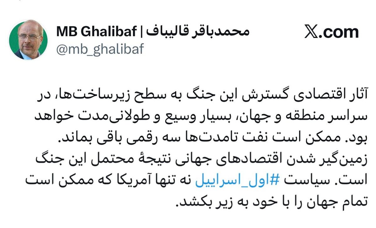 : «Экономические последствия расширения этой войны до уровня инфраструктуры, как в регионе, так и во всём мире, будут чрезвычайно масштабными и долгосрочными. Цены на нефть могут оставаться трёхзначными в течение длительного времени. Парализованная глобальная экономика — вероятный результат этой войны. Политика Израиля угрожает не только США, но потенциально может тянуть за собой весь мир».