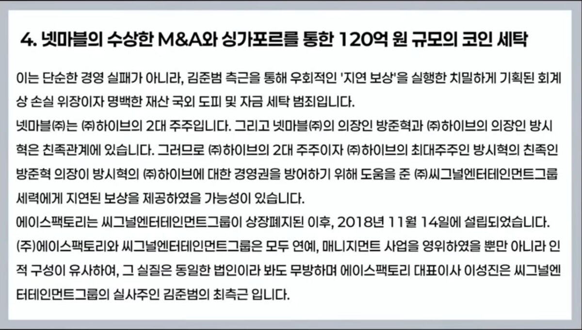 Подозрительные сделки по слияниям и поглощениям со стороны Netmarble и отмывание криптовалюты на сумму 12 млрд вон через Сингапур. Это не просто неудача в управлении, а тщательно спланированная бухгалтерская манипуляция, замаскированная под убытки, через которую окружение Ким Джунбома осуществило косвенную "отложенную компенсацию". Речь идёт о явном преступлении, связанном с выводом активов за рубеж и отмыванием средств. Netmarble Co., Ltd. является вторым крупнейшим акционером Hybe. Кроме того, председатель Netmarble Бан Джунхёк и председатель Hybe Бан Шихёк состоят в родственных отношениях. Таким образом, существует вероятность, что Бан Джунхёк, являющийся родственником Бан Шихёка и председателем второго крупнейшего акционера Hybe, мог предоставить отложенную компенсацию силам Signal Entertainment Group, которые помогали защищать управленческий контроль Бан Шихёка над Hybe. Компания Ace Factory была основана 14 ноября 2018 года после того, как Signal Entertainment Group была исклю