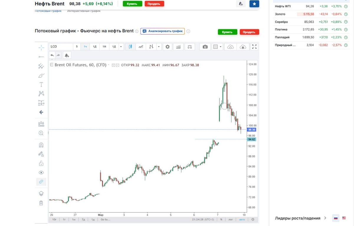 внимание к курсу черного золота Утром на пике в 120$ пошли продажи и на данный момент курс проколол вниз психологический 100$ и если закроет окно и уйдет ниже 94$, то что это значит: а) Юные дарования и начинающие спекулянты типа сынка Трампа вышли с рынка, продав контракты, этакие быстрые шахматы. Редко, но так бывает б) У Ирана все плохо и он проигрывает и будет сдаваться в) Трамп(США) решили выскочить и зафиксить профит с конфликта и ведут сепаратные переговоры. Все что выше - это продолжение войны схемы и карты