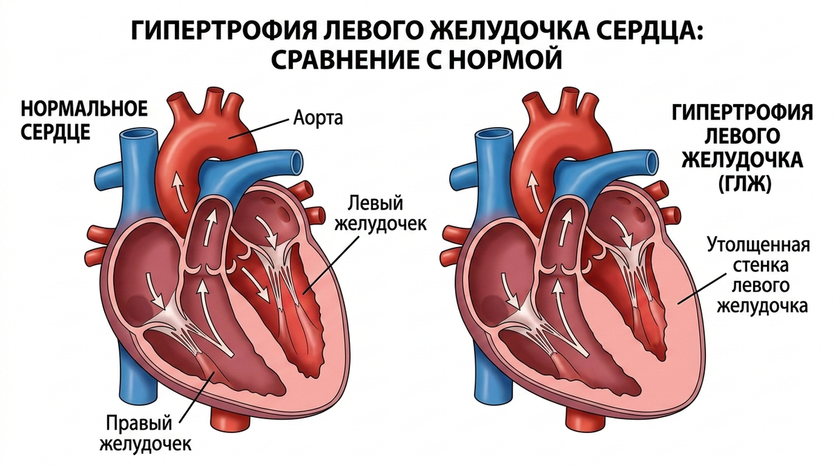 Почему именно он? Левый желудочек - это «главный мотор» нашего сердца, который выполняет самую тяжелую работу, выталкивая кровь в аорту для снабжения всего организма. Когда нагрузка на него становится чрезмерной, мышца начинает «качаться» и увеличиваться в объеме, точно так же, как бицепс в спортзале.