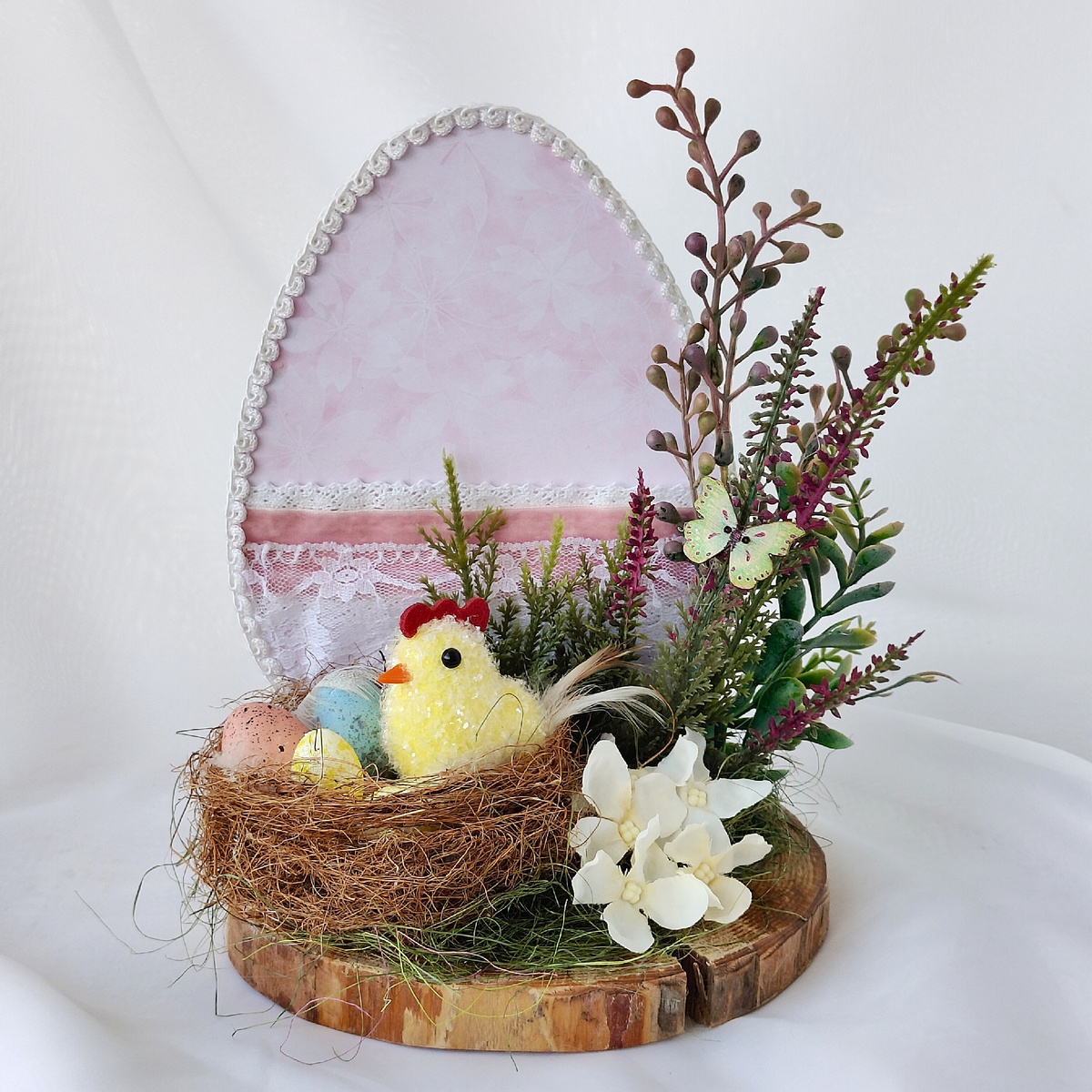 - Акценты: фигурка цыпленка, искусственные цветы и бабочка, декоративные яйца.