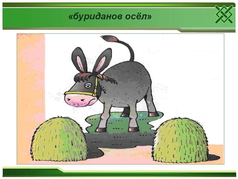 Сложность такой ситуации отражена в известном парадоксе под названием "Буриданов осёл". Буриданов осёл - это философский парадокс, названный по имени Жана Буридана, хотя подобная ситуация описана ещё в трудах Аристотеля, где был поставлен вопрос: как осёл, которому предоставлены два одинаково соблазнительных угощения, может рационально сделать выбор? Лейбниц довёл ситуацию до абсурда - он пришёл к заключению, что осёл умрёт из-за своей нерешительности выбрать тот или иной стог сена.