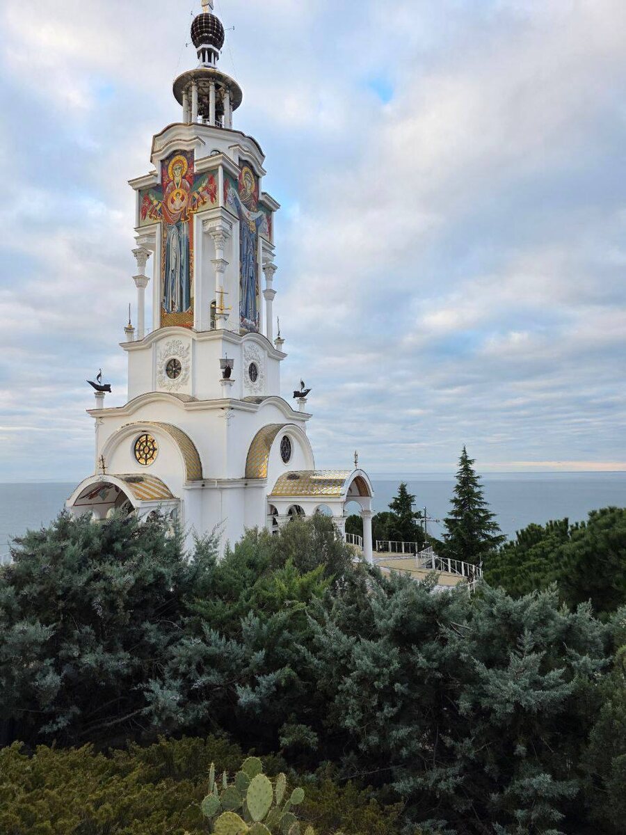 ⛪️ Храм-маяк Святителя Николая Чудотворца Храм в Малореченском необычен не только своей архитектурой, но и деталями. Он задуман как храм и символический маяк одновременно. Высокая башня поднимается примерно на 54 метра, поэтому её хорошо видно далеко с моря. В храме есть два уровня: — небольшой нижний храм, где проходят богослужения и утренние литургии — и большой храм, который открывают для по сещения позже. На самой вершине установлен большой позолоченный крест. Днём он сверкает на солнце, а вечером верхняя часть храма подсвечивается, и башня становится заметным ориентиром над побережьем. Рядом находится музей катастроф на водах, посвящённый памяти погибших в море.