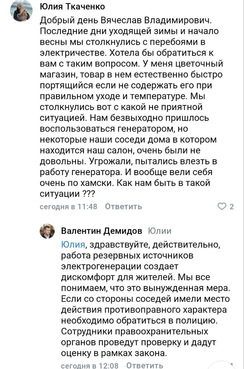 Валентин Демидов заступился за предпринимательницу, получавшую угрозы за использование генератора