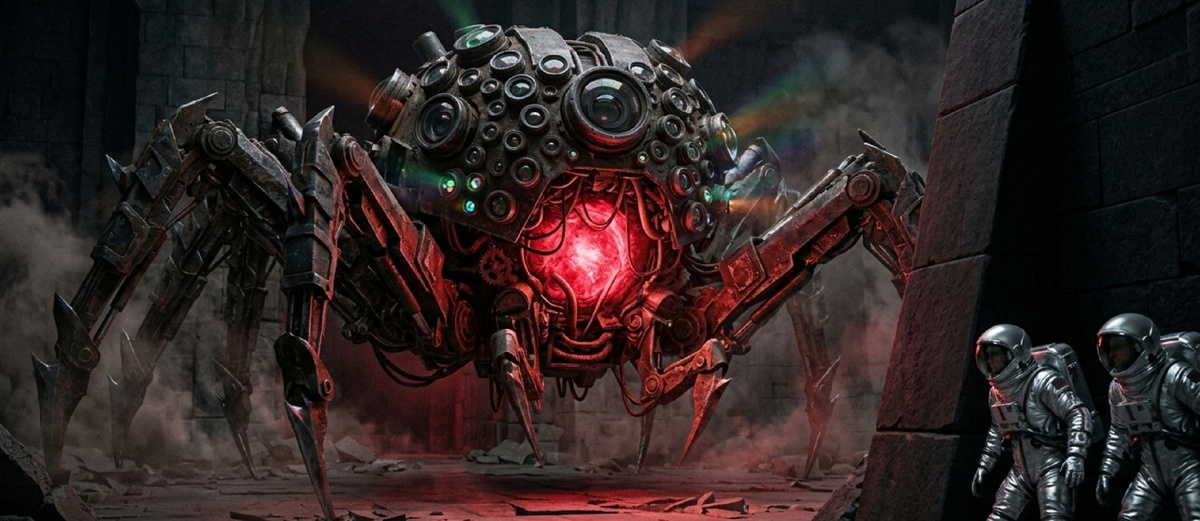 Чудовище, которое стражи называли Палачом, было уже почти полностью снаружи. Оно напоминало гигантского паука, но из чёрного металла, с десятками конечностей, каждая из которых заканчивалась острым шипом. Его тело было усеяно линзами — сотни глаз, сканирующих пространство во всех спектрах. В центре, там, где у паука должна быть голова, пульсировал багровый сгусток света — его «мозг», его сердце, его проклятие.