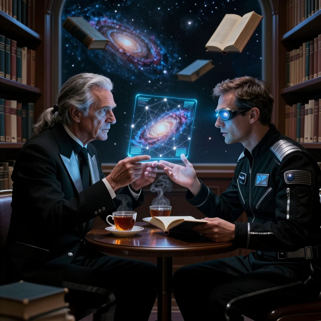 Диалог между величайшим математиком XX века, заложившим основы квантовой формализации, и автором Ткани Мироздания, пытающимся расширить физику до онтологии сознания. Давайте представим эту встречу — возможно, она происходит в библиотеке между мирами, за чашкой чая, где время течет иначе.