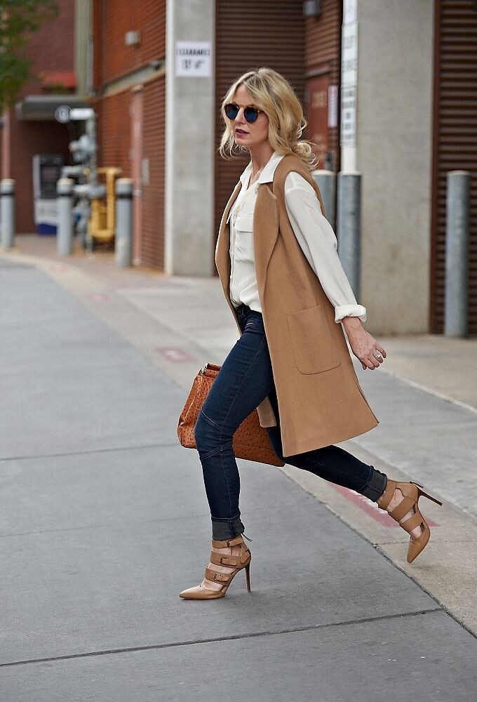Жилет – практичный и универсальный элемент гардероба, который современная стильная женщина умеет вписать практически в любой «лук», от строгого и делового до повседневного и даже романтичного. И даже более того: грамотно добавленный к наряду жилет способен изменить все впечатление об образе. 1. Удлиненный жилет с широкими лацканами, напоминающий классическое пальто без рукавов, привнесет деловую нотку в расслабленный и демократичный casual-образ. Так модель бежевого оттенка с квадратными накладными карманами отлично дополняет собой ансамбль из зауженных темно-синих джинсов, подвернутых на щиколотках, и белой рубашки, аккуратно заправленной за пояс. 2. Фактурный вязаный жилет – стильная вещь, которая добавляет современным образам романтичности и нежности. Например, нежно-бежевая модель с глубоким V-образным вырезом становится уютным и комфортным дополнением к прямым темно-серым брюкам строго кроя и белоснежной рубашке. 3. Костюмный жилет, надетый в качестве первого слоя одежды, выглядит