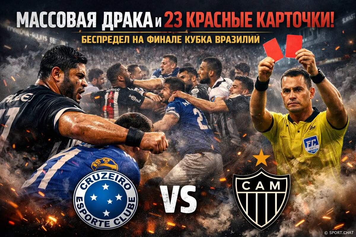 Финальный матч Кубка Бразилии между «Крузейро» и «Атлетико Минейро» завершился грандиозным скандалом и массовой дракой, которая вспыхнула в концовке встречи. Напряжение на поле достигло предела, и обычная игровая стычка за считанные секунды превратилась в настоящее побоище. Футболисты обеих команд, а также представители тренерских штабов сошлись в массовой потасовке прямо на поле. Игроки толкались, наносили удары руками и ногами, а эпизод быстро перерос в жесткую драку «стенка на стенку», которая продолжалась несколько минут и больше напоминала бойцовский турнир, чем футбольный матч. В эпицентре конфликта оказались и бывшие игроки «Зенита» — Жерсон, Матео Кассьерра и Халк. Особенно громким оказался эпизод с участием Халка, который в разгаре потасовки нокаутировал соперника ударом в затылок, что лишь усилило хаос на поле. Судейская бригада была вынуждена вмешаться максимально жестко. После того как страсти удалось погасить, арбитр показал рекордное количество удалений — в общей сложност