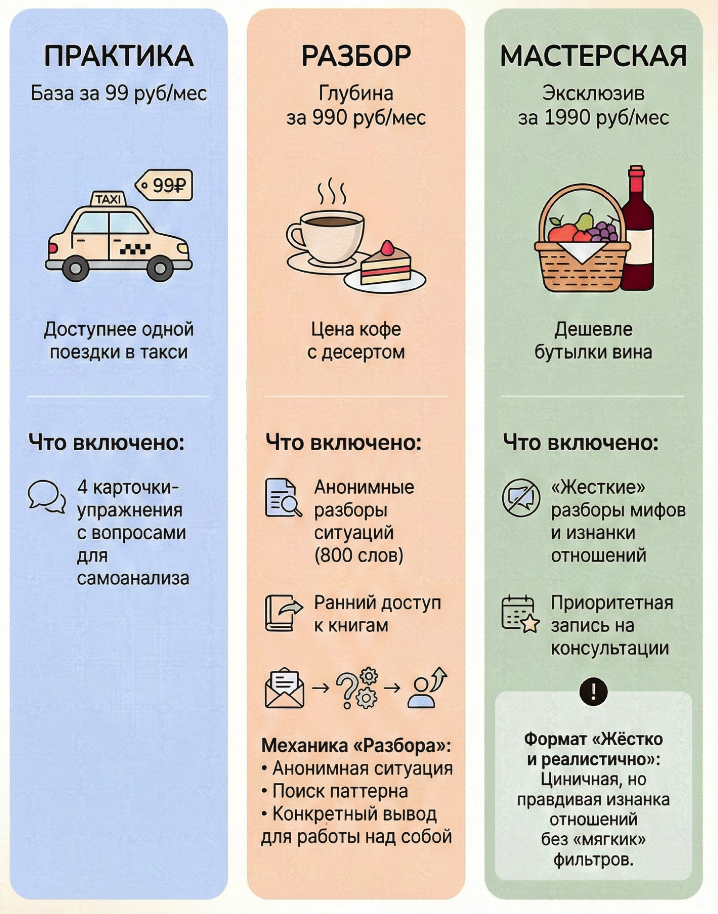 На канале открыта Премиум-подписка — упражнения, разборы реальных кейсов и эксклюзивные материалы по психологии конфликтов и отношений: избегающие и тревожные, настоящие и бывшие партнёры, выход из токсичных отношений и построение здоровых эмоциональных связей в браке и и не только. Это не замена персональной консультации, а возможность детально погрузиться в тему в ином формате. Подписка содержит публикации из Раздела Премиум и разделяется на три уровня: Подключить Премиум-подписку просто — откройте любую публикацию из Раздела Премиум и нажмите «Подключить». Если Вас интересует личная консультация, свяжитесь со мной: Официальный сайт проекта: ReConnector.ru Стоимость 99 ₽ в месяц по стоимости дешевле 1-ой поездки в такси до соседнего района. Стоимость 990 ₽ в месяц по стоимости кофе с пирожным в хорошей кофейне. Стоимость 1990 ₽ в месяц по стоимости меньше чем фруктовая корзина или бутылка хорошего вина на вечер. Итак, вы можете выбрать любой интересующий Вас уровень и оформить подпи