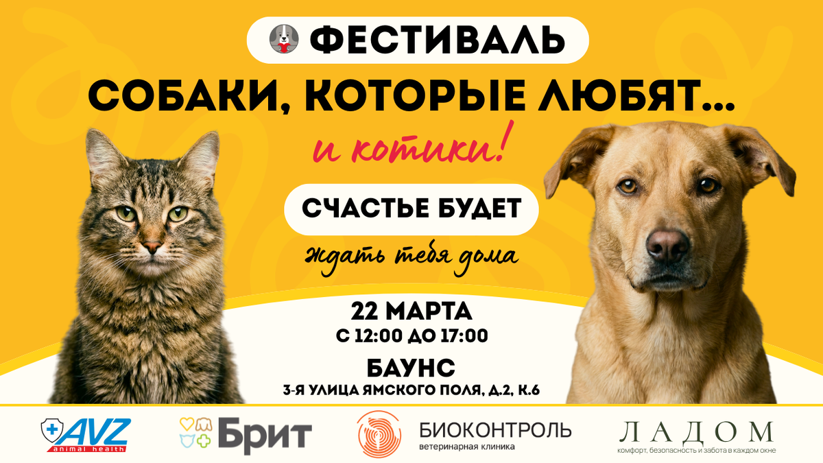 Приглашаем на фестиваль «Собаки, которые любят… и котики!» В этот день точно изменятся чьи-то судьбы: можно будет познакомиться с животными из приютов, почувствовать контакт и найти нового друга. Что вас ждёт на фестивале? ✅ Знакомства с животными Собаки и кошки, готовые к семье. Волонтёры расскажут о характере, привычках и особенностях каждого хвостика. ✅ Консультации специалистов и мастер-классы Специалисты расскажут о том, как подготовиться к новому питомцу и дадут ответы на вопросы об адаптации, поведении, здоровье, уходе и жизни с животным. Можно спрашивать всё, что волнует. ✅ Благотворительный маркет Приятные и полезные покупки. Каждая - вклад в чью-то историю, ведь вырученные средства пойдут на помощь бездомным животным. ✅ Пункт сбора помощи Вещи, делающие жизнь животных, которые пока только ищут своего человека, комфортнее: корм, лекарства, игрушки, вкусняшки. 📍 22 марта 🕒 12:00–17:00 📌 Баунс от Omega Events - метро Белорусская, 3-я улица Ямского поля, д.2, к.6 📌 Вход свобо