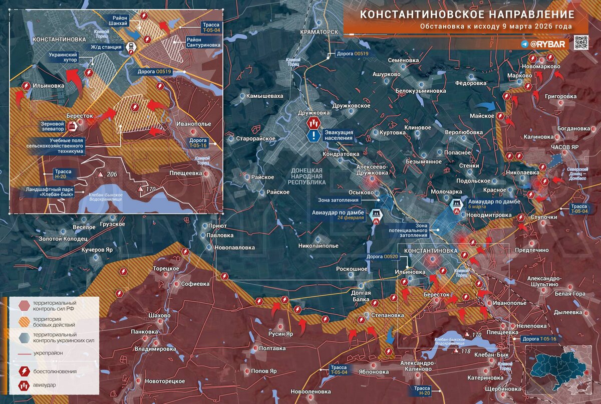 🔸На Константиновском направлении российские войска реализуют возможности, полученные в результате удара по дамбе в районе Молочарки. Как и в случае с поражением дамбы у Осыково, позиции противника в прилегающем частном секторе оказались подтоплены. Лишившиеся укрытий подразделения ВСУ отошли в капитальную застройку Константиновки. Из-за перенасыщенности позиций на «передке» личным составом они регулярно подвергаются ударам дронов и артиллерии. ️При этом ВС РФ пока не ведут масштабных штурмовых действий в городе. Это обусловлено тем, что на его подступах и окраинах по-прежнему сохраняются достаточно обширные «серые зоны», которые никто уверенно не контролирует. 🔸Также ВС РФ еще предстоит как следует закрепиться на южных окраинах, обезопасив подходы к городу и наладив снабжение передовых подразделений. Сейчас с этим есть сложности, поскольку противник вновь значительно нарастил на направлении число операторов БЛА. Подобная тенденция отмечается и на соседних участках фронта. 📍Карта в в