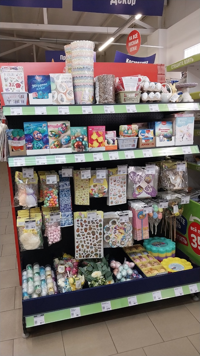 В Фикс Прайсе все готово к Пасхе. Покажу вам витрину с товарами.
