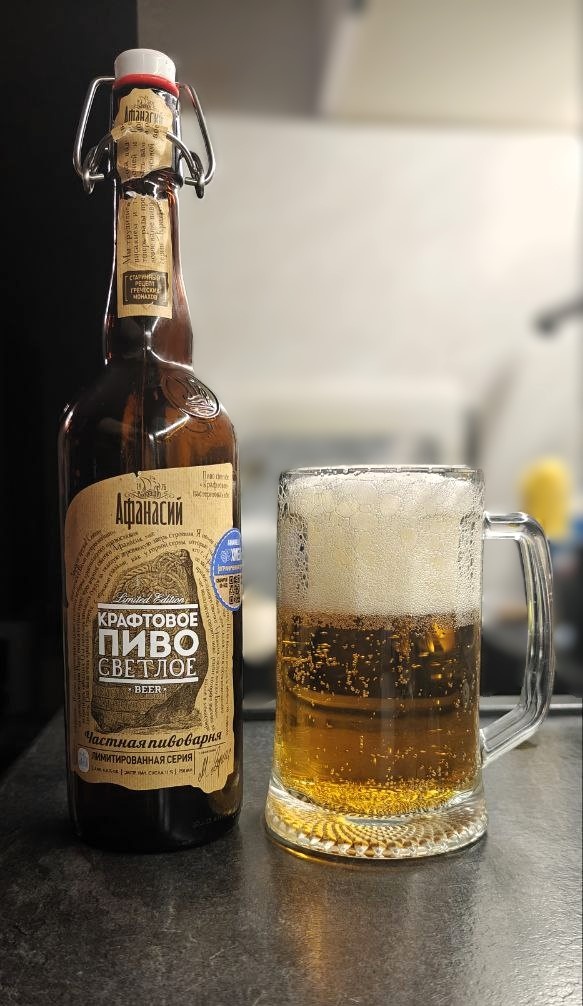 Всем привет! Всех девушек с прошедшим 8 марта, спасибо что вы есть у нас, будьте счастливы и дарите счастье своим мужчинам. А нас мужики я поздравляю с 9 марта - днем переживших 8-е марта. И отметить его конечно нужно пенным. Что-то давно на канале не было ничего от тверского Афанасия, исправляюсь. Сегодня на дегустации крафтовое пенное от этого холдинга. Афанасий крафтовое квалифицируется как светлое пастеризованное пиво. Имеет крепость - 4,5% и плотность 11%. Было куплено в "перекрестке". Состав простой: Вода, солод ячменный, хмель, хмелепродукты. Продается в бутылках из коричневого стекла с бугельной пробкой и объемом в 0,75 л. Дизайн бутылки в едином стиле Афанасия. Дизайн этикетки интересный (есть что почитать), на этикетке изображено письмо о том как рецепт данного пива был высечен в камне, ну и изображен сам камень. Этикетка сделана с помощью шелкографии(могу ошибаться, но очень похожа). Также имеется наклейка с описанием хмеля. Цена: около 250 рублей. Срок годности: около 8 ме
