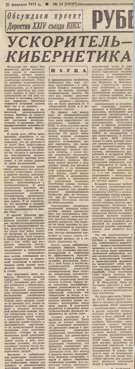 Короче говоря, кибернетика открывает широкие возможности для ускорения научных исследований и повышения их эффективности, быстрейшего претворения в жизнь полученных результатов. Именно с этой целью в научно-исследовательских институтах Министерства химической