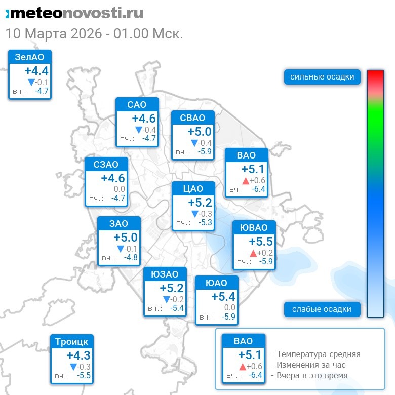 В 1:00 в Москве было от +3.7°C до +5.8°C, средняя температура +4.9°C #погода #Москва #весна #температура #10марта #вторник
