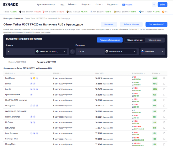 Многие опытные участники рынка перед визитом в офис используют специализированные мониторинговые сервисы, такие как Exnode. Платформа позволяет быстро сравнить обменники криптовалют в Краснодаре, посмотреть текущие курсы и ознакомиться с отзывами клиентов. Это помогает заранее оценить репутацию площадки и избежать сомнительных предложений.