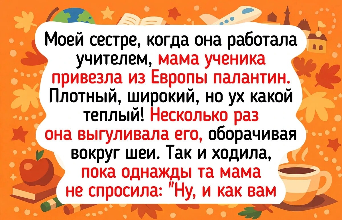 Моей сестре, когда она работала учителем, мама ученика привезла из Европы палантин. Плотный, широкий, но ух какой теплый! Несколько раз она выгуливала его, оборачивая вокруг шеи. Так и ходила, пока однажды та мама не спросила: «Ну, и как вам скатерть? Понравилась?» © gulmira_life
