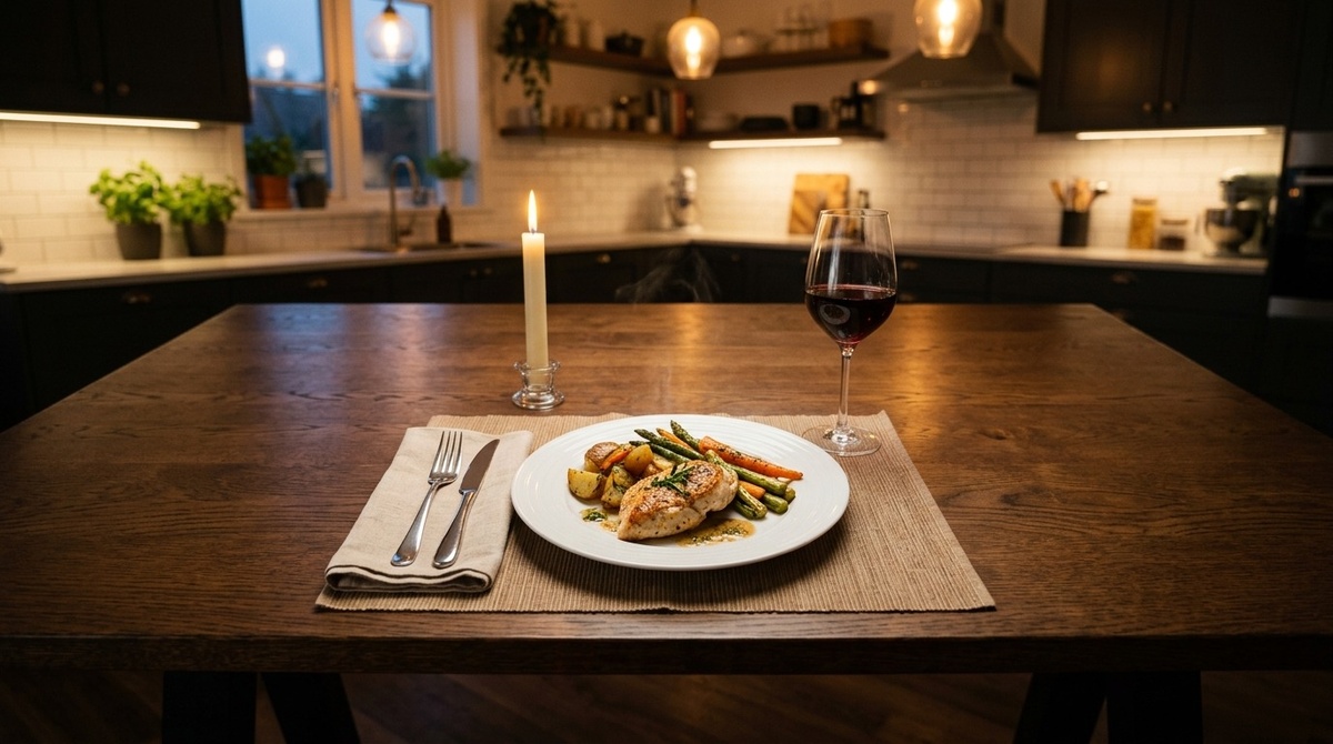 Я готовила. Не для двоих – для одной. Салат. Горячее – куриная грудка с овощами. Бокал вина. Десерт – купила пирожное в кондитерской, одно.