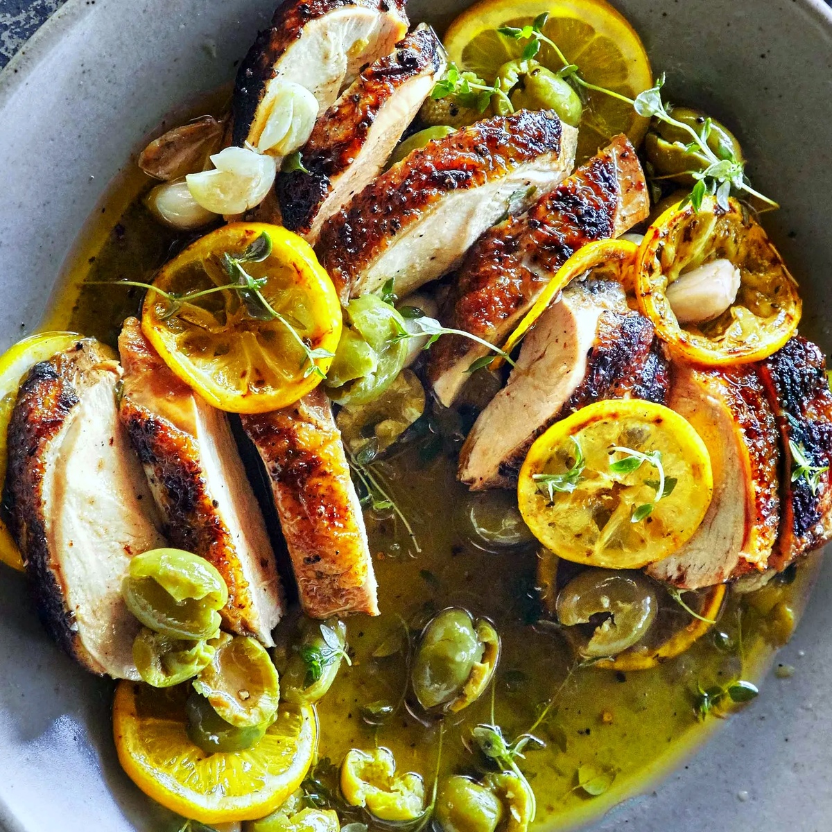 ■ Чеснок очистите, оливки при необходимости порежьте напополам. Нарежьте 1 лимон тонкими ломтиками, очистите от семян.