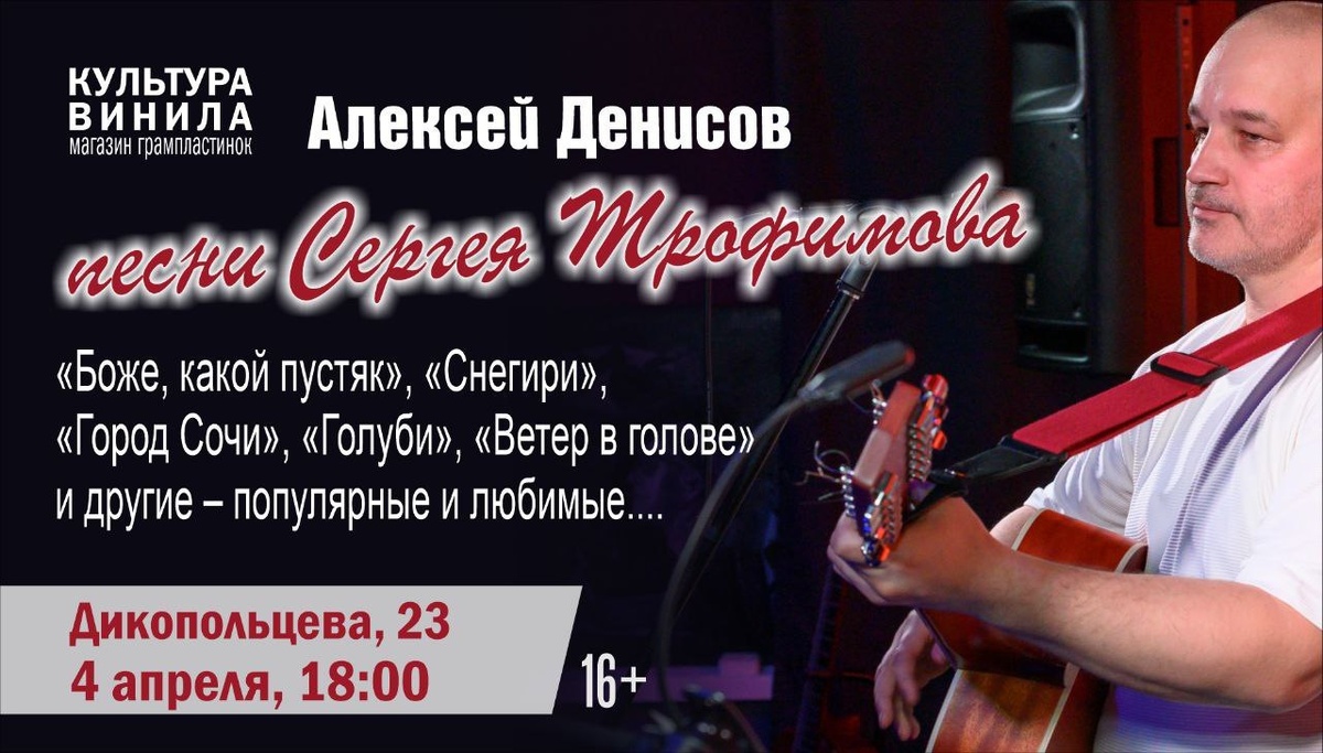 ✔ Исполнение Алексея Денисова. ✔ Популярные и любимые песни Сергея Трофимова: «Боже, какой пустяк», «Снегири», «Город Сочи», «Голуби», «Ветер в голове» и другие. ✔ Живой звук и тёплая атмосфера музыкального вечера. 📅 Когда: #4_апреля 18:00 ⛳ Где: Культура Винила, ул. Дикопольцева, 23 💳 Стоимость: 1500 ₽ Билеты 👉 Афиша Хабаровска. Куда сходить, экскурсии