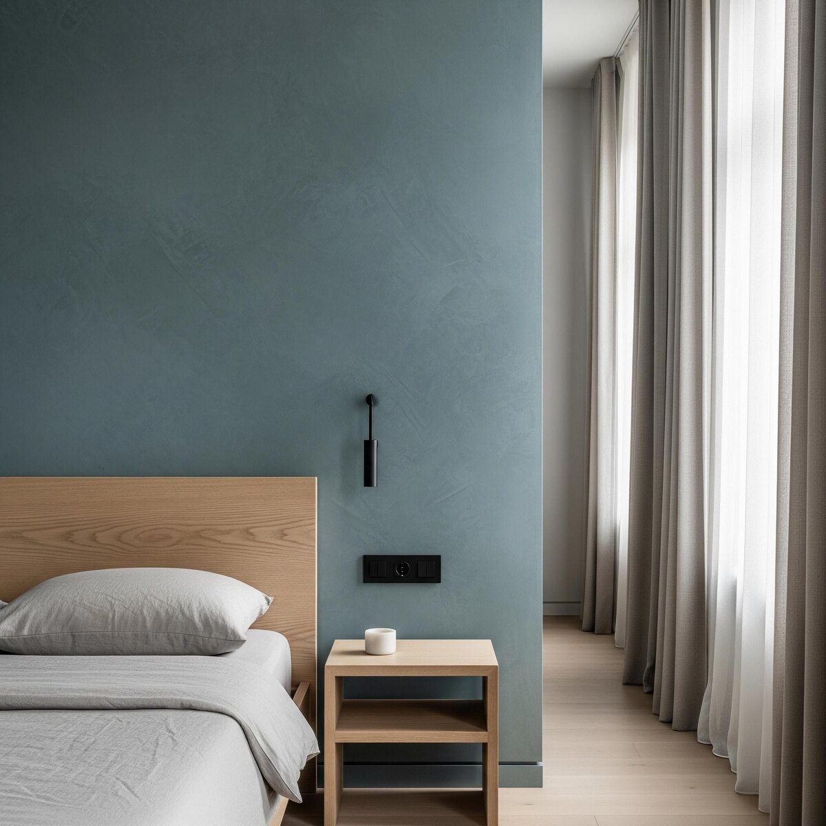 Дерево не такое нейтральное, как кажется. У него есть температура. И эта температура всегда влияет на цвет стены. Тёплый дуб рядом с холодным оттенком усиливает разницу. Ясень работает мягче. Орех почти всегда добавляет глубину, но может «утяжелить» светлые стены. Если холодный цвет выбран точно, дерево делает его живым. Если оттенок случайный — появляется ощущение грязи. Что работает 1. Холодные серо-голубые с глубокой базой. На фоне тёплого дерева становятся чище и графичнее. 2. Холодный серо-шалфей без желтизны. Зелёный с серой базой и полностью убранной теплотой. Светлый ясень рядом делает его глубже и спокойнее. Контраст температуры остаётся, но без конфликта. 3. Глубокий холодный индиго. Не декоративный синий, а плотный, почти ночной оттенок. Орех или тёплый дуб усиливают его глубину. Цвет становится архитектурным, а не эмоциональным. Что важно в поверхности Рядом с деревом плоская краска часто выглядит слишком простой. Нужна живая, минеральная текстура, которая добавляет глу