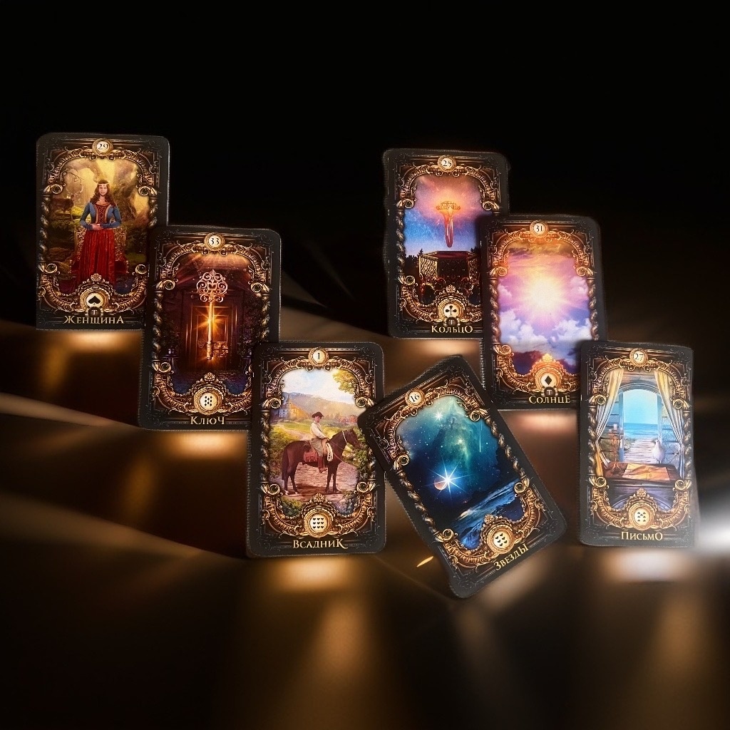 Здравствуйте, мои дорогие! С удовольствием помогу вам приоткрыть завесу тайны и прочитать послание, которое Вселенная передает вам через эти удивительные карты. Выпавшие карты: Ключ, Всадник, Кольца, Солнце, Письмо, Звезды. Это очень мощная и позитивная комбинация. Давайте разберем ее по частям, чтобы понять общую картину. Краткое толкование карт 1. Ключ: Главная карта в этом раскладе. Символизирует решение, ответ на давний вопрос, шанс, который нельзя упустить. Это открывающаяся дверь и освобождение от старых ограничений. Ключ говорит: «Ты готов узнать правду или найти выход».