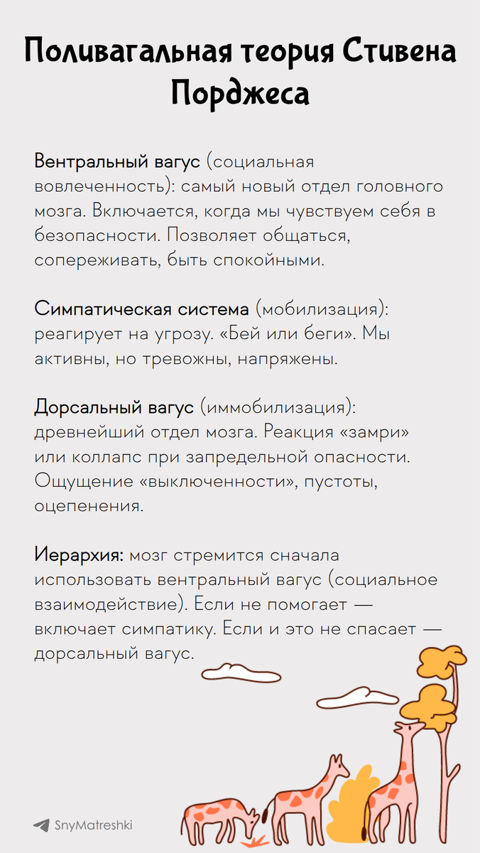 Теория Стивена Порджеса объясняет, как нервная система определяет наше чувство безопасности, социальную вовлеченность и реакции на угрозу. Простыми словами — это «карта» наших автоматических состояний. Поливагальная теория помогает понять, почему мы иногда «выпадаем» или становимся агрессивными — это не слабость, а работа древних систем выживания. Поддержать автора Александра Бóгдан,
