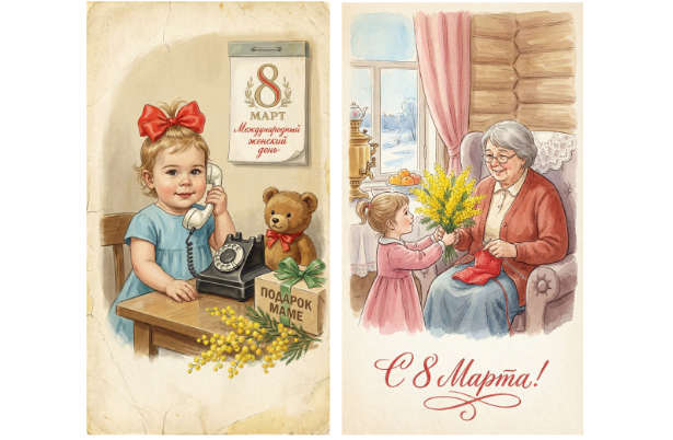 Винтажная иллюстрация в стиле советской открытки 1950-х годов: девочка 3 лет в простом светло-голубом платье с крупным ярко-красным бантом в волосах, сидящая за столом. Она держит в руке белую трубку старинного телефонного аппарата; рядом на столе — дисковый телефон. Справа от девочки стоит плюшевый мишка с бантом у шеи и подарочная коробка с зелёной лентой, на коробке четко читается надпись на русском: «ПОДАРОК МАМЕ». На стене позади — лист календаря с крупной цифрой «8 МАРТ» и надписью курсивом «Международный женский день». На переднем плане — веточки мимозы с желтыми пушистыми соцветиями. Композиция — портретная, кадр по пояс, персонажи и предметы центрированы, фотографический ракурс слегка сверху. Стиль исполнения: ручная живопись (акварель с элементами гуаши и пастели), мягкие кистевые штрихи, тонкая зернистая фактура бумаги, приглушенная тепловая палитра (кремовые, бежевые и охристые тона фона), акцентные цвета — голубой платья, красный бант, желтая мимоза. Лёгкая виньетка по краям, имитация старой бумаги с потёртостями, трещинками и пожелтением, чуть приглушенные контуры, мягкие тени, ровное рассеянное освещение, атмосфера ностальгии и сентиментальности. Детали и типографика: каллиграфическая рукописная надпись «Международный женский день» курсивом красным цветом; цифра «8» крупная, в декоративном ретро-шрифте. Надпись на коробке — строгими заглавными буквами. Добавить слегка потертые края и узоры старой печати. Технические параметры для генерации: вертикальная ориентация, соотношение сторон 2:3 (вертикальное), высокое разрешение, фотореалистичная текстура бумаги, стиль — иллюстрация/живопись, мягкая детализация, сохранить ретро-атмосферу. Не добавлять современные предметы, логотипы, водяные знаки; избегать слишком резкой цифровой четкости и ультра-реализма — сохранить живописную, слегка стилизованную эстетику." (Рекомендуемые отрицательные теги: современная электроника, водяные знаки, английский текст, ультра-реализм, тяжелая HDR-обработка.)