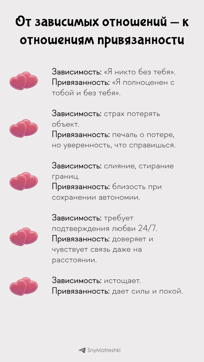 Зависимость (созависимость) и привязанность — это разные вещи. Первая истощает, вторая — питает. Переход от зависимости к привязанности — это путь к себе. Вы больше не «половинка», ищущая целого, а целый человек, выбирающий делиться своей полнотой с другим. Поддержать автора Александра Бóгдан,