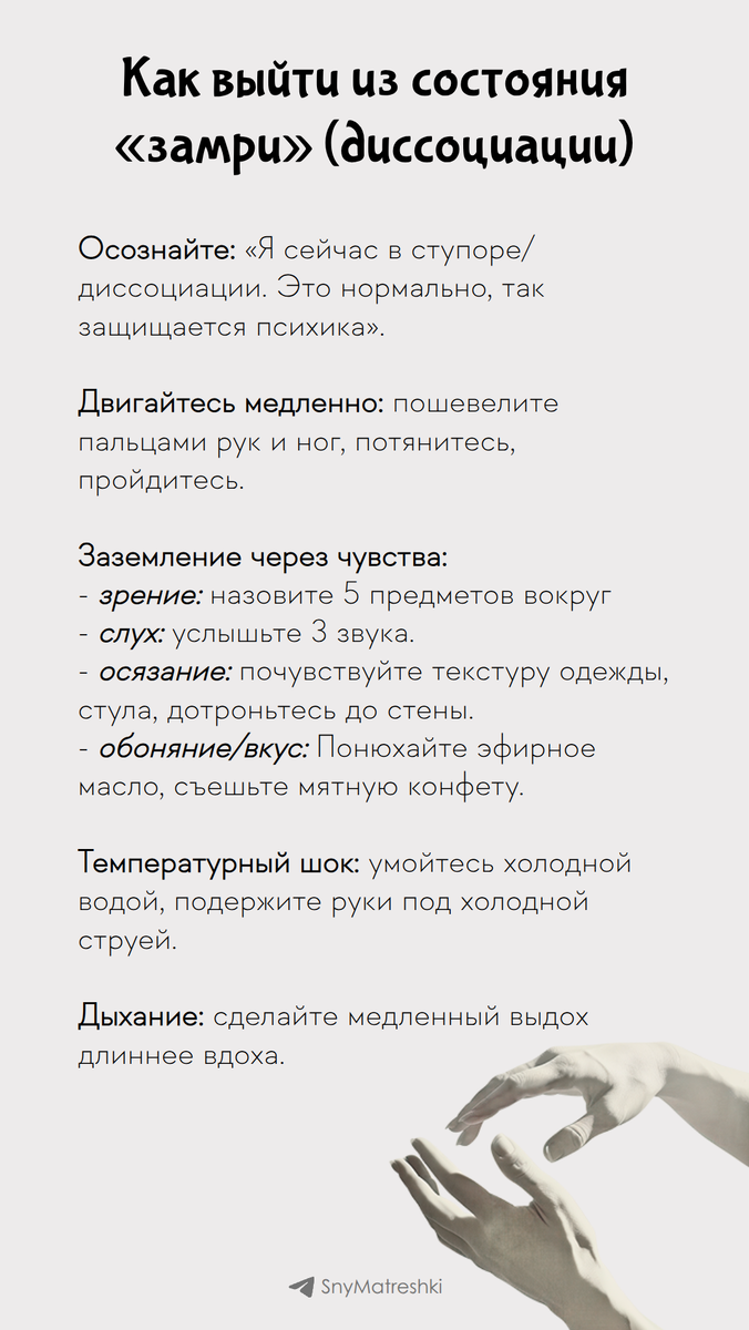 Состояние «замри» — это защитный механизм психики, когда перегрузка слишком велика. Чтобы вернуться в тело и настоящее, нужны мягкие, заземляющие действия. Возвращение из «замри» требует терпения. Регулярная практика заземления учит нервную систему, что сейчас безопасно, и она может расслабиться. Поддержать автора Александра Бóгдан,