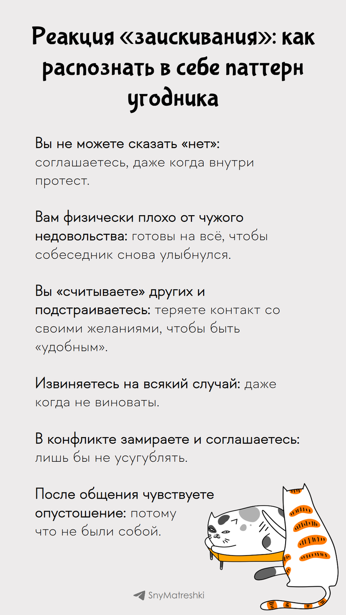 Термин заискивание описывает стратегию выживания, при которой человек пытается умиротворить угрозу через угождение, соглашательство и стирание себя. Это частая реакция у тех, кто рос в среде, где безопасность зависела от настроения другого. Заискивание — это предательство себя ради иллюзии безопасности. Начать выздоравливать можно с маленьких шагов: замечать свои «да» и спрашивать «А чего хочу я?». Поддержать автора Александра Бóгдан,