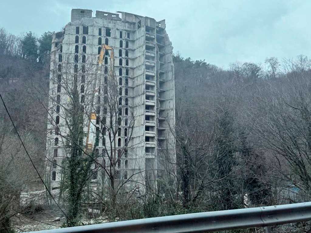 В посёлке Уч-Дере под Сочи стартовал снос 16-этажного недостроенного здания бывшего пансионата «БАМ», которое простояло без эксплуатации 47 лет. На площадке уже работает спецтехника. Коробку высотки возвели в 1979 году — здесь планировалось открыть пансионат, однако из-за нехватки финансирования проект заморозили. С тех пор объект оставался заброшенным и постепенно разрушался, став одной из самых узнаваемых недостроек курорта. О планах демонтировать аварийное здание городские власти заявляли ещё в 2023 году, однако фактические работы начались только сейчас. Ранее сообщалось, что на месте долгостроя появится лечебно-оздоровительный комплекс «Вера». Изначально проект заявлялся как четырёхзвёздочный, однако позднее на официальном сайте была указана категория 5*. Завершить строительство планируется к 2028 году. Управлять новым гостиничным комплексом будет компания Azimut Group. Фото: телеграм-канал «Чё Происходит?! Сочи/Сириус»