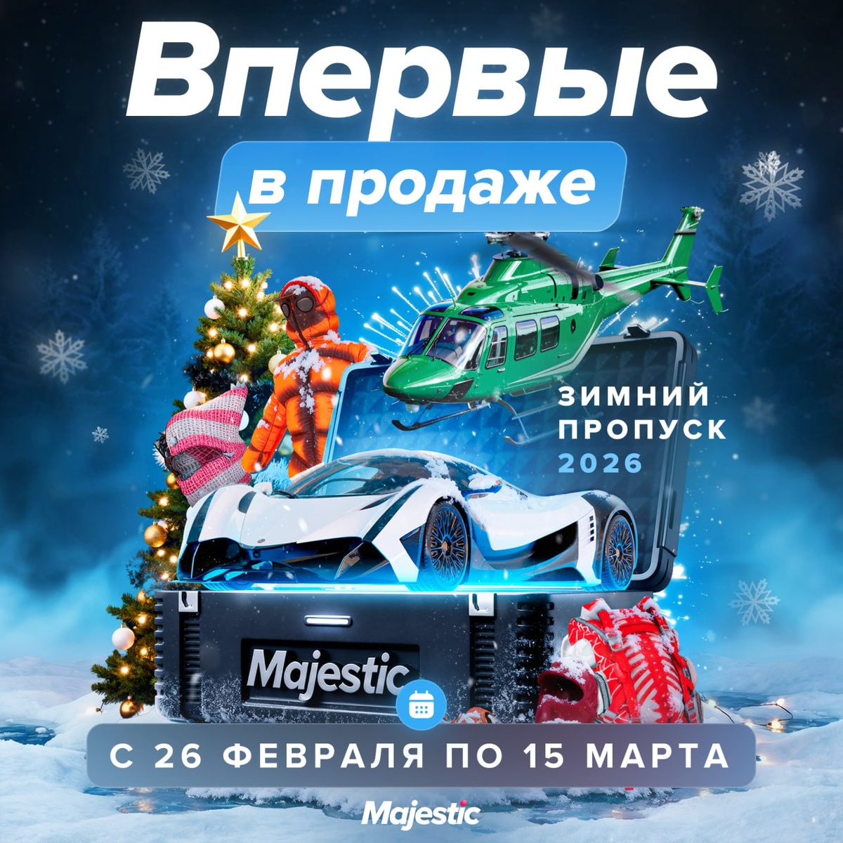 » Получите еще больше наград этого сезона — заберите все, что пропустили в ленте, и доведите свой прогресс до максимума. ❄️ Но и это еще не все! Оба кейса «Зимний пропуск 2026» и «Автомобильная коллекция 2026» будут доступны дольше. Акция продлится до 15 марта 06:00 (МСК) — найти кейсы легко: F2 >> Магазин >> Кейсы. ❤️ Majestic Role Play
