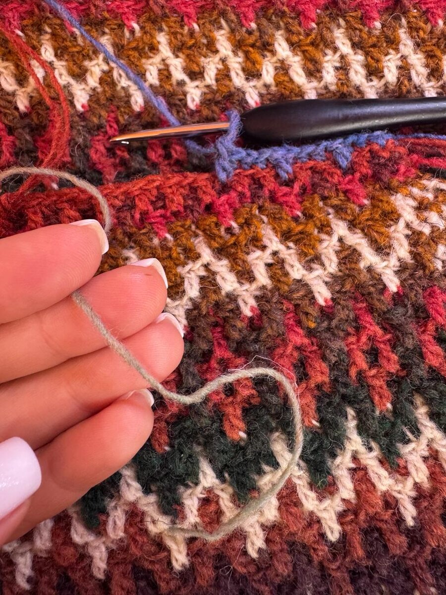 Чуть более сглаженный или поярче, чтобы придать нужный акцент. Я вяжу ромбами и зигзагами – это очень простой и при этом эффектный узор, в котором по-прежнему соблюдено правило «один цвет в ряду», но полотно получается суперцветным. Сейчас я подбираю цвет для вязания центра ромба. Эта цветовая точка обрамлена снизу красным, коричневым и белым – те же цвета будут и сверху (ну примерно те же, это же Дундага). Вот провязала немного синим – не то, попробую заменить на этот еле-еле зеленоватый. Видео и схему этого узора вы найдете на моих каналах в YouTube, VK Video и в Дзене.