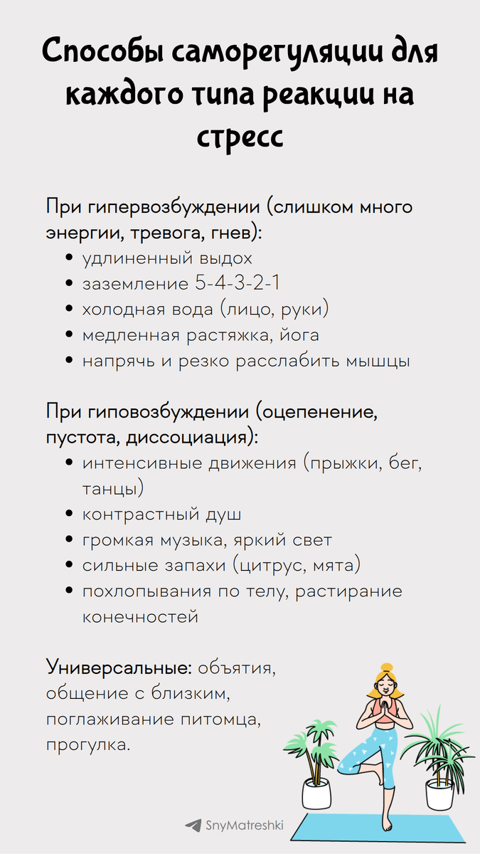 Универсальных методов нет — то, что помогает при гипервозбуждении, может не работать при гиповозбуждении. Важно подбирать стратегию под свое состояние. Научившись распознавать свой тип дисрегуляции, вы сможете подобрать ключик к своей нервной системе. Поддержать автора Александра Бóгдан,